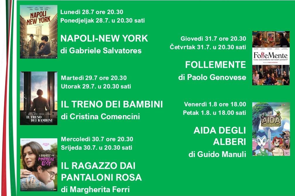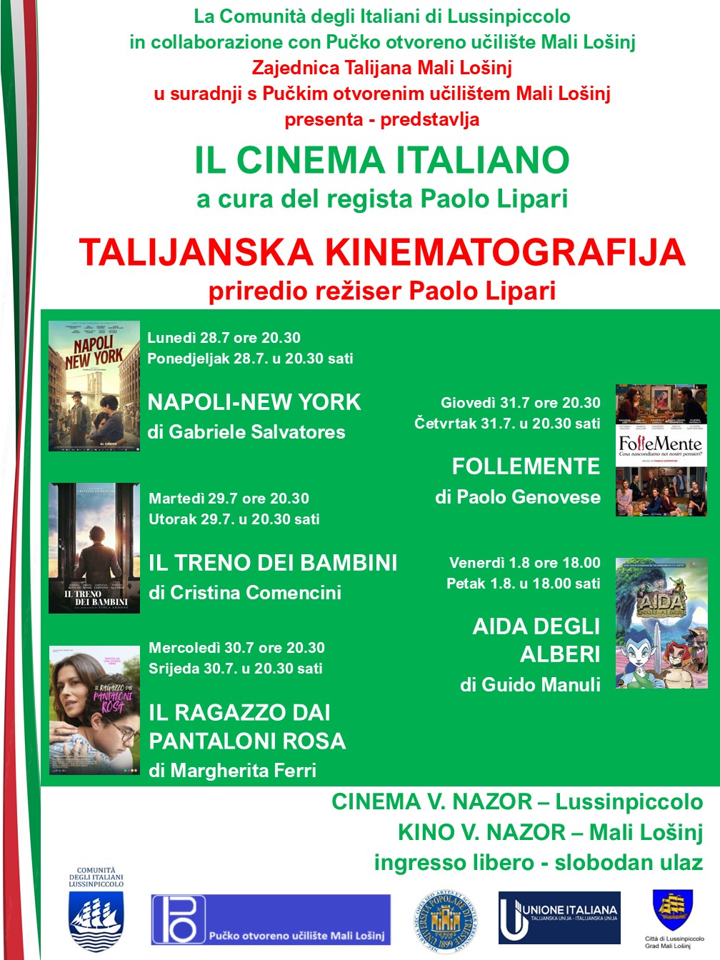 La Comunità degli Italiani di Lussinpiccolo e l’Università Popolare Aperta di Lussinpiccolo hanno il piacere di annunciare la Settimana del Cinema Italiano, che si terrà dal 28 luglio al 1º agosto presso il Cinema Vladimir Nazor.